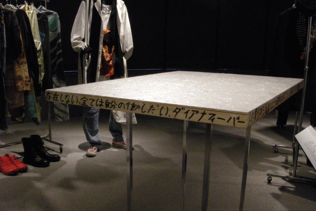 壁を作らない空間にしたんです。YOSHIくんが創作していた机を真ん中に置いて、その奥に原宿で着ていたジャケットが自然に見えるように照明を当てました。スクリーンも、仕切りを作らず映像がずっと見えている状態にして、全体がつながっている空間にしたかったんです。YOSHIくんがこの世界に現れて、そこから人とのつながりが「波紋」のように広がっていくイメージです。円形の会場もそのイメージに合っていましたし、キャプションも普通の展覧会のようなものじゃなくて、関わった人たちの“話し言葉”だけで構成しました。布に印刷して、風に揺れるようにしたのも、固定したくなかったからです。どこまでも続いていく波紋のように、彼のエネルギーを受け取った人たちが、また誰かへとつないでいく展示にしたかったんです。