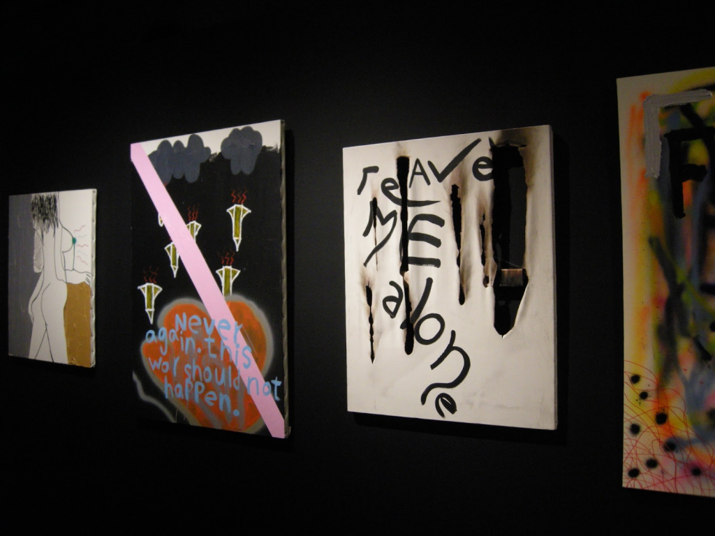 本当はもっとたくさんの作品があるんですが、今回はその一部をお借りして展示させていただきました。作品の中には、キャンバスを切り裂いているものとか、燃やしているものもあって、とにかくメッセージがすごく強い。