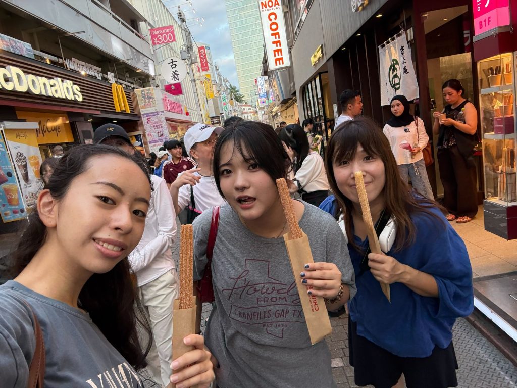 その後、竹下通りの老舗「マリオンクレープ」(神宮前1-6-15)に立ち寄り、かつての食べ歩きの思い出を振り返りながら、なおは「いつかマリオンクレープを取材してみたいね」と次の企画を考えていました!お腹もすいてきたところで、最後にCHUROS(神宮前1-17-5)へ立ち寄り、サクフワ食感のチュロスを3人で食べ歩きしました!