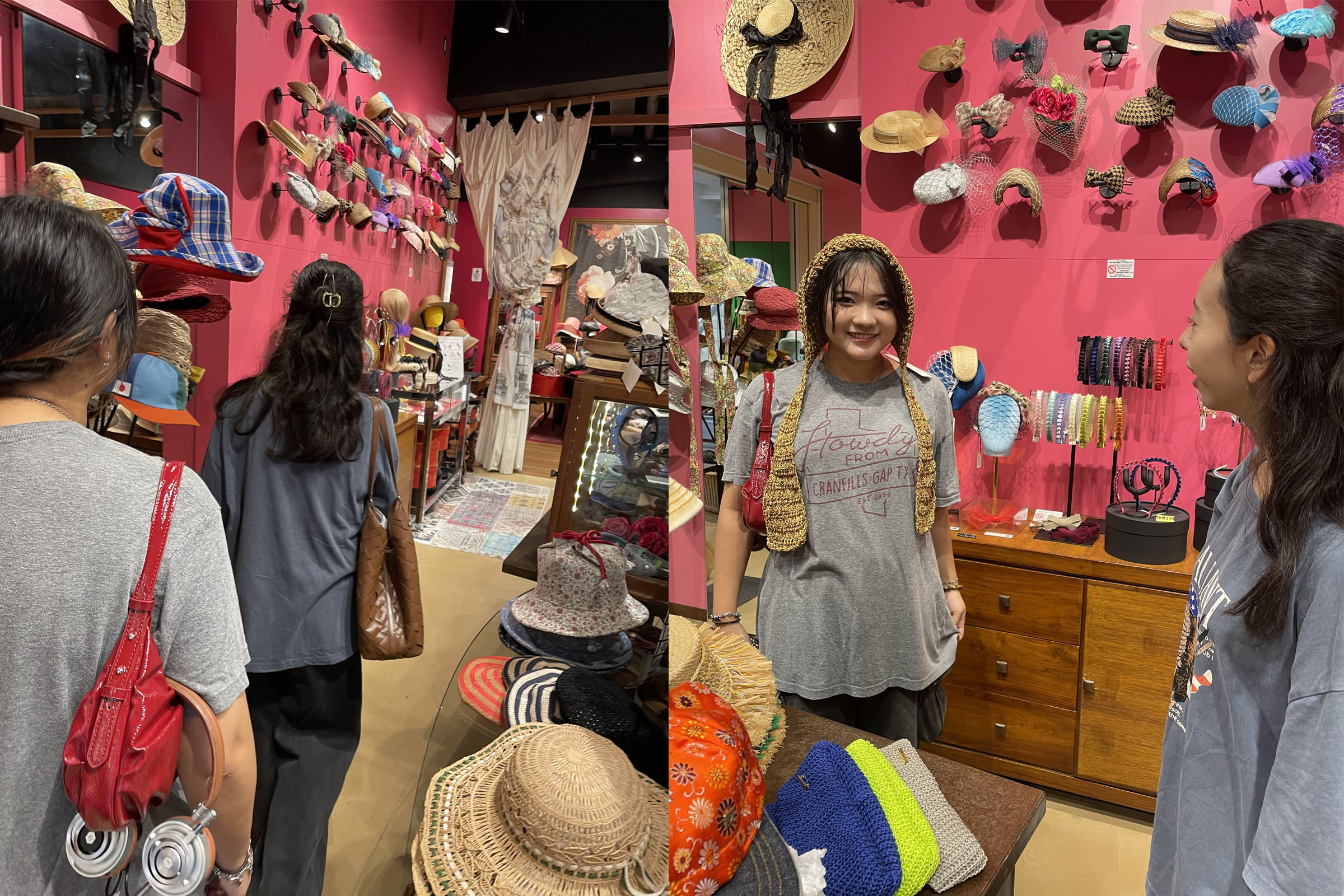 そんなファッション談義をしながら明治通りを歩いていると、今年6月にオープンした新しい帽子専門店「Chapeau bas!」(神宮前6-18-12)を発見。店内には個性的な帽子がずらりと並び、おおはるは黄色のニットキャップを試着。メンバーから「似合う!」と絶賛され、思わず購入を迷う場面も。