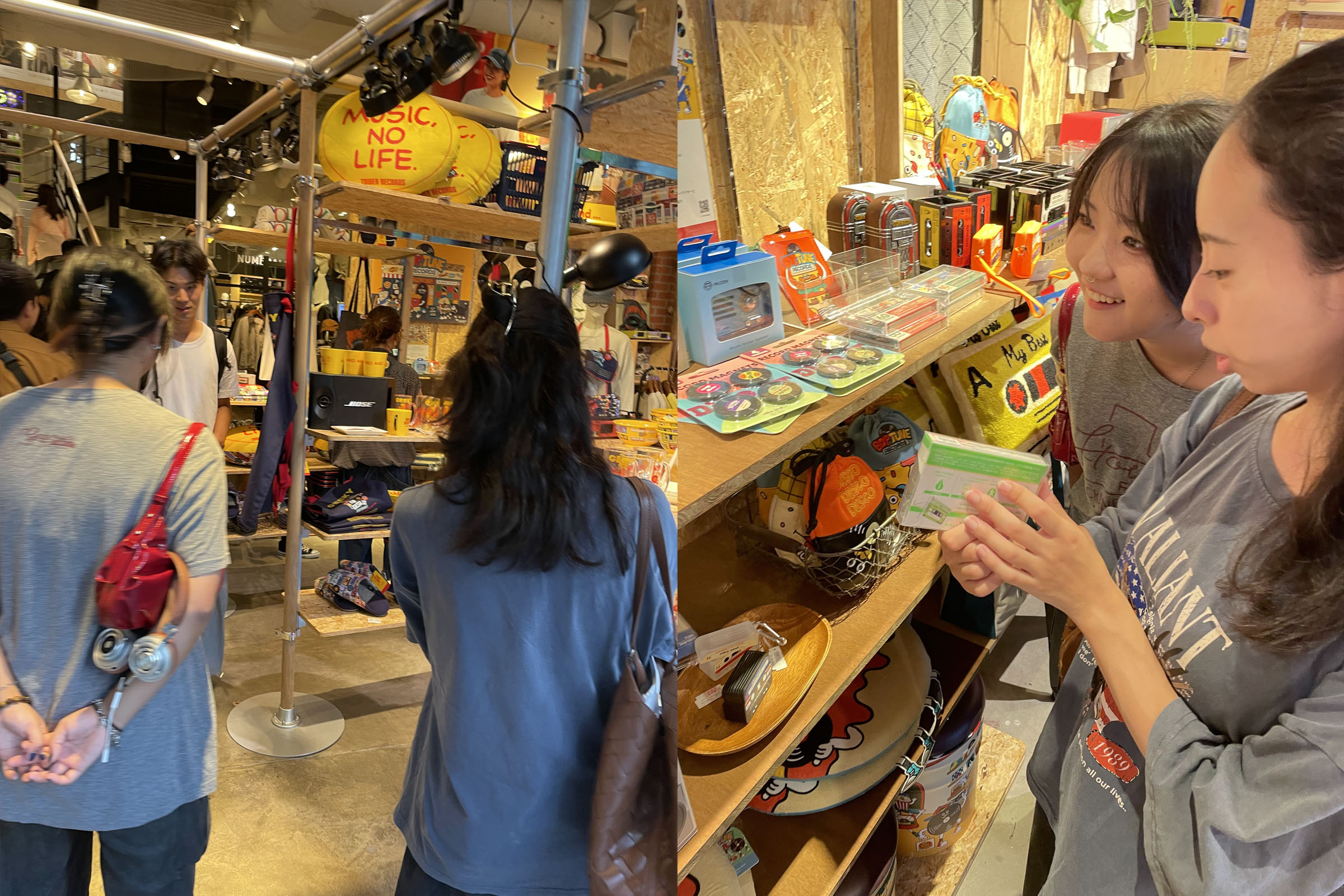 続いて訪れた「niko and …TOKYO」(神宮前6-12-20)では、タワーレコードとのコラボグッズ(スウェット、ロンT、キャップなど)が限定で販売されていました。レトロなカセット型スピーカーを前に、なおは「これ欲しい!」と迷わず手に取り、しばらく眺めていました。