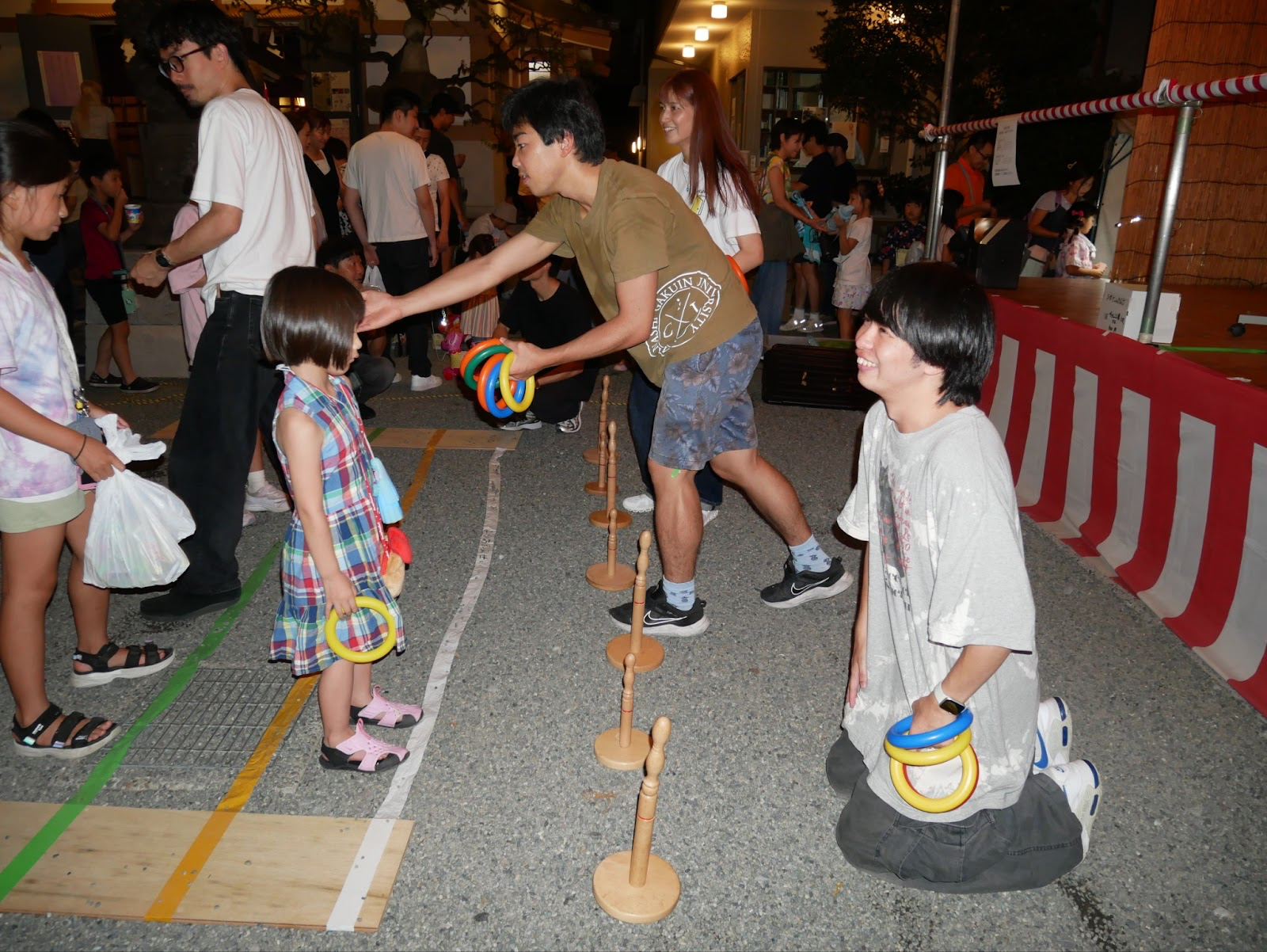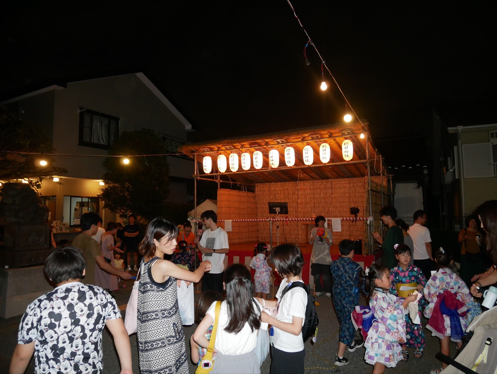 最後に全員が穏田神社に集合すると、境内は屋台や子どもたちのゲーム、カラオケ大会で大にぎわいでした。リゴは以前、夏祭りを取材した経験があり、コロナ禍で中止や小規模開催が続いていたため、復活して賑わいを取り戻した光景に感動していました。