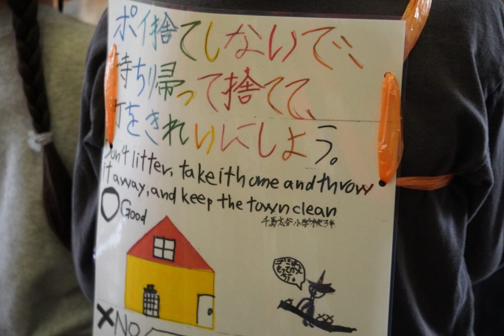 子どもたちは「ポイ捨てしないで!」「街をきれいに!」といった自分なりのメッセージを描いた啓発ポスターを背中に掲げ、当日の活動に臨みました。ハロウィーンの日ということもあり、インバウンド観光客向けに英語や韓国語、中国語など表記もいろいろ。