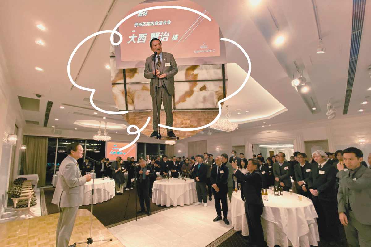 乾杯の音頭を取った渋谷区商店会連合会 会長の大西賢治さんからは、「今の渋谷・原宿の勢いは、まさに大谷翔平選手!」という、今の時代らしい例えも飛び出しました。 「絶好調な時こそ、掃除や防犯といった『足元』の活動を疎かにしないことが、次の世代へ繋ぐ責任なんだ」というお話に、私も深く頷いてしまいました。